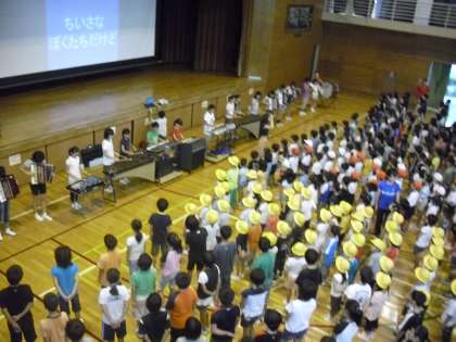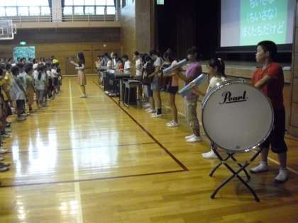 今朝の音楽朝会の様子です。今月の歌は「あの青い空のように」です。各クラスの音楽時間に練習をしてきました。まずは、器楽委員会の合奏に合わせて歌います。