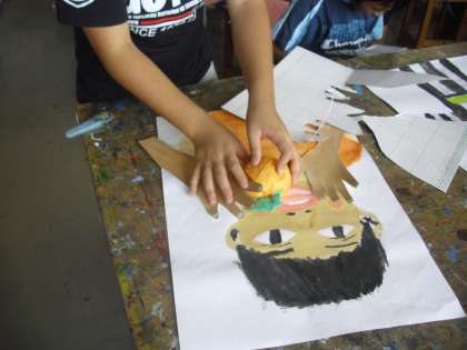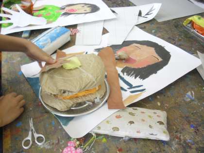 4年生の図画工作の授業の様子です。「わっ、おいしそう」の制作に取り組んでいるところです。食べ物の立体作品をどのようにかかえたらおいしそうに見えるかがポイントです。