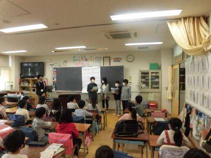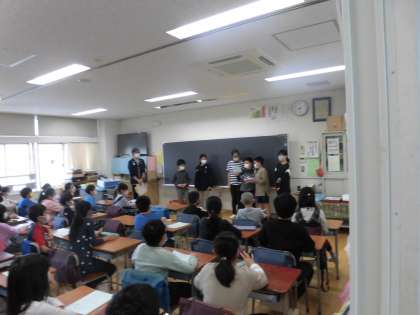 11月8日(月)朝の時間、6年生が家庭科「60周年おめでとう!ケーキを作ろう!」の学習で作ったケーキを、各学年に一言添えて配りに行きました。