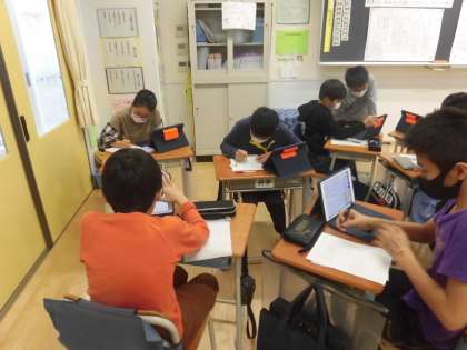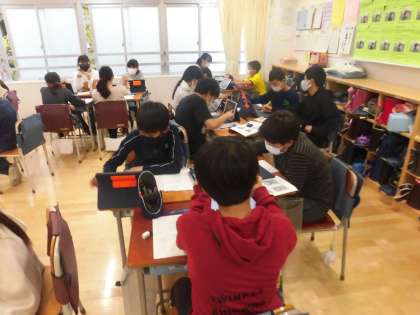 子供たちは、グループごとにタブレットを使いながら話合いをしました。パネルディスカッションに向けて、準備が着々と進んでいます。
