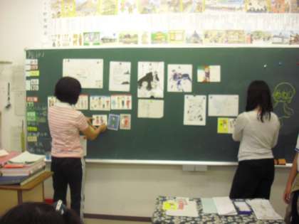 マンガクラブの様子です。一人一人がオリジナルのキャラクターを考え描いていきます。卒業生の作品なども参考に紹介しました。