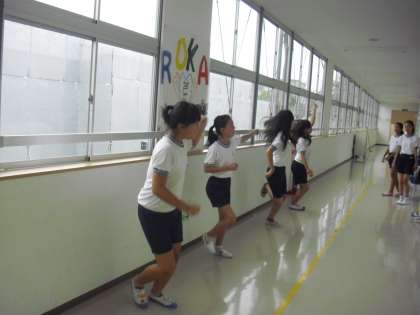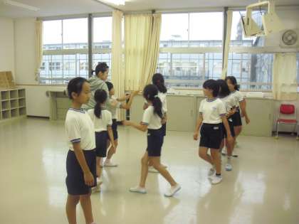 ダンスクラブの様子です。講師の先生といっしょに振り付けの確認をしているところです。グループに分かれて練習をしました。