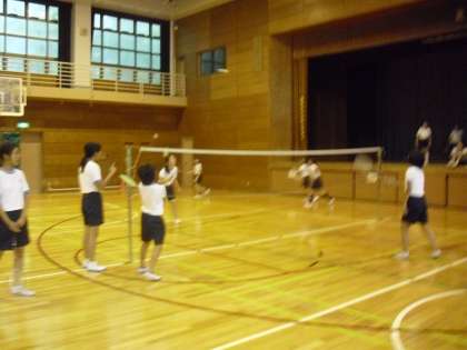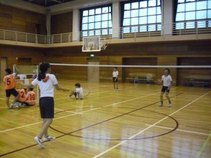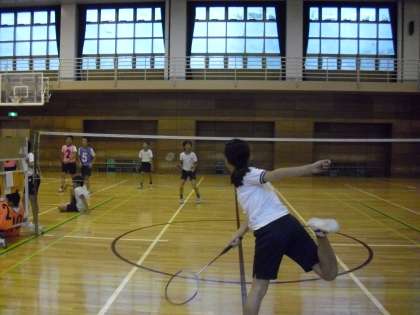 バトミントンクラブの様子です。ネットを使って打ち合いやゲームを楽しんでいます。打ちやすいところにシャトルが来るとラリーも続きます。