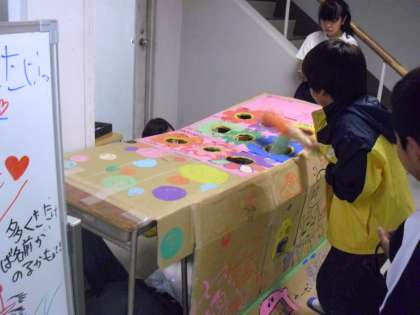 中学生のお店の様子です。「もぐらたたきゲーム」を行っています。小学生がたたくことができるように上手に出してくれました。