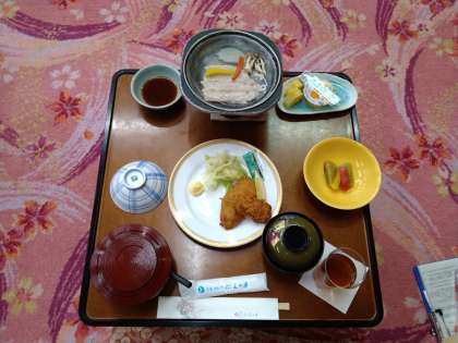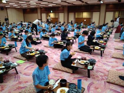 早いもので日光での夕食も最後となりました。手際よく自分の場所につき、默食もなれました。集団宿泊の気持ちよい過ごし方も板についてきました。ランプファイヤーにそなえて、みんなお揃いの学年Tシャツで食べました。