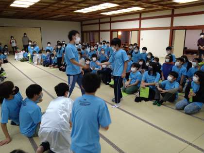 食事後、楽しみにしていたランプファイヤーを大広間を借りて行いました。バス号車対抗だるまさんの一日、爆弾ゲーム、手をつながないマイムマイムなど担当のレク係が趣向を凝らしたゲームにみんなの笑顔が溢れていました。6年生のみんなの仲の良さや優しさがいっぱいだった1時間15分でした。