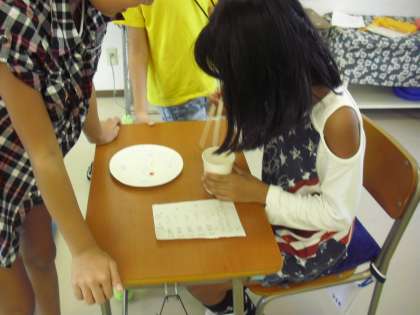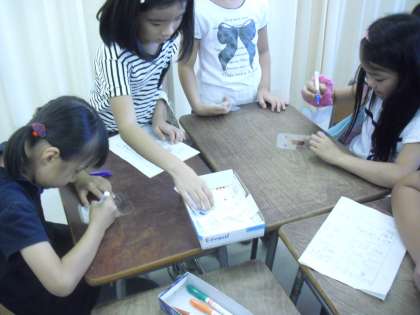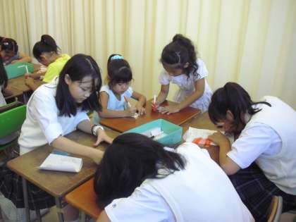 5年生のお店の様子です。プラバンのお店は、中学生も作品作りに夢中になっていました。小中学生が仲良く座って作っています。