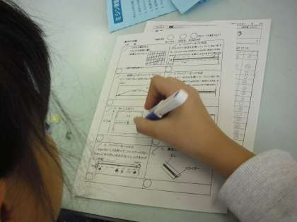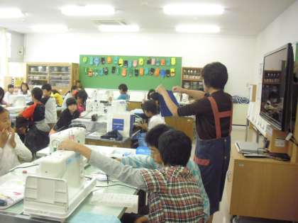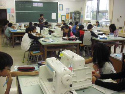 5年生の家庭科の授業の様子です。これからミシンを使って生活に役立つものの制作に取り組んでいきます。事前に学習カードで作り方を確認しています。