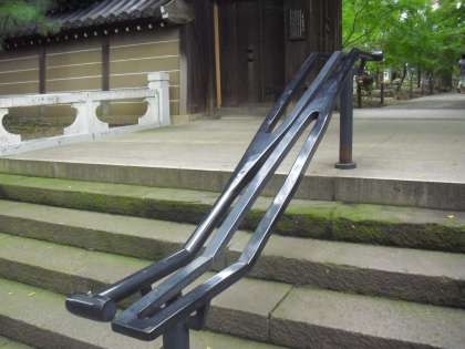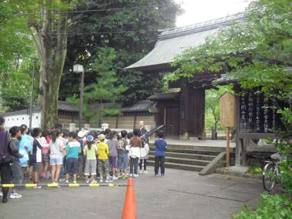 3年生の社会科見学の様子です。まず、向かったのは九品仏浄真寺です。参道を真っ直ぐ進むと般舟場と書かれた総門があります。手すりは船の櫓で、三途の川を渡るときに使うそうです。