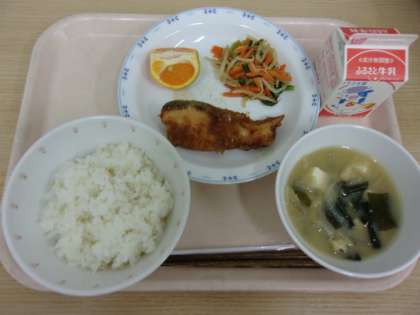今日は、5年生のオンライン食育授業とコラボし、北海道産の「秋鮭」と「昆布」を取り入れた給食です。秋鮭は油で揚げて「南蛮漬け」に、昆布は「出汁」に使いました。うま味を活かして、さっぱりした和食に仕上げました。