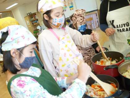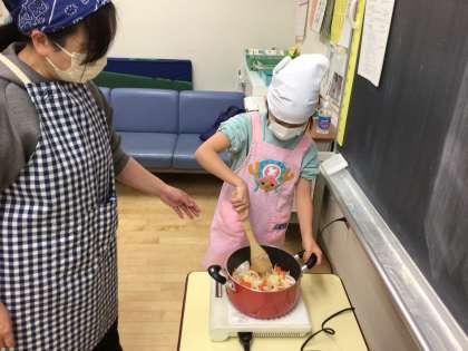 子供たちは、包丁を使って野菜を細かく切ったり、ホットプレートで野菜を炒めたりしました。「野菜を上手に切れたよ!」、「炒めてるといいにおいがする!」と、楽しそうに作っていました。食べた後は、自分で使った食器をきれいに洗いました。