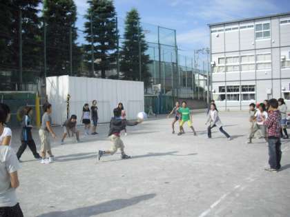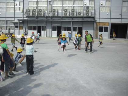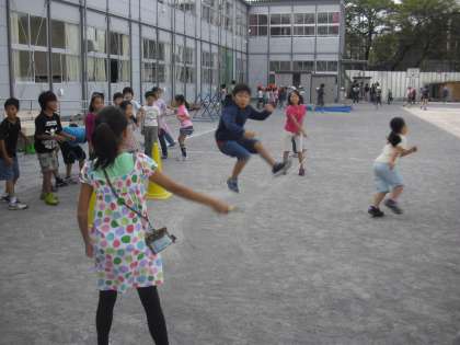 今朝の学級遊び「みんなでたのしく」の様子です。校庭は、1・3・5年生の割り当てです。長なわ跳びやドッジボールをして仲良く遊んでいます。