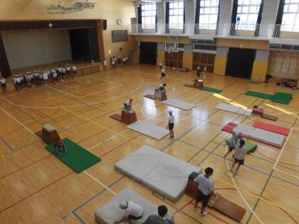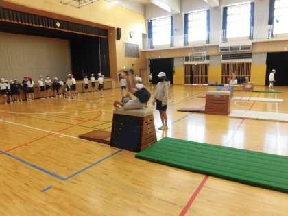 子供たちは、練習を繰り返しながら、友達にもらったアドバイスを聞いて技の完成度を高めていました。次に練習する首はね跳び、頭はね跳びに繋がるポイントを一生懸命学びました。