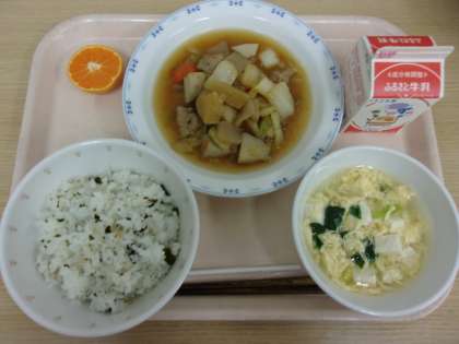 米(茨城)、豚肉(北海道)、鶏卵(栃木)、豆腐(東京)、炊き込みわかめ(韓国・徳島)、じゃこ(瀬戸内海)、白ごま(ナイジェリア・パラグアイ)、板こんにゃく(群馬)、里いも(埼玉)、ねぎ・にんじん・大根(東京)、白菜・小松菜(茨城)、しょうが(高知)、みかん(愛媛)