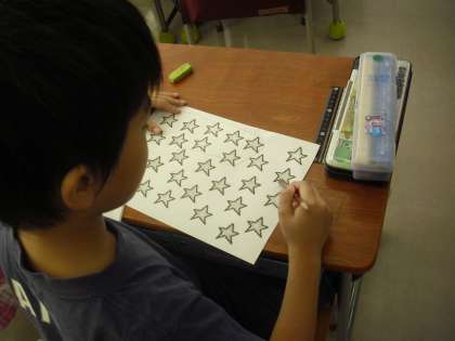 1年生の算数の授業の様子です。数を数える学習です。たくさんの数を数えるときの数え方を考えます。これまでに学習したまとまりを活用していきます。
