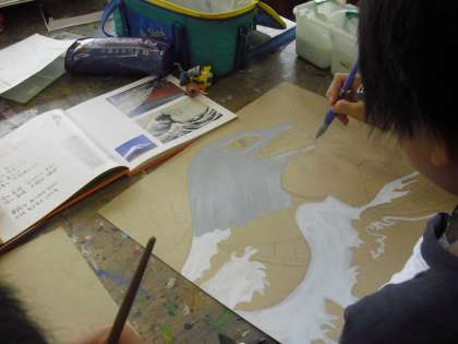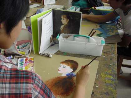 6年生の図画工作の授業の様子です。「芸術家の心に触れて」制作に取り組んでいるところです。芸術家の名画を選び、自分なりの工夫を加えていきます。
