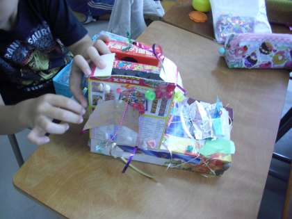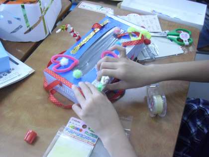 1年生の図画工作の授業の様子です。「お気に入りの『うきうきぼっくす』を作ろう」に取り組んでいます。空き箱を利用して、オリジナルの箱を作っています。紐を通して肩からかけるようにしたり、飾りを付けたりと楽しそうです。