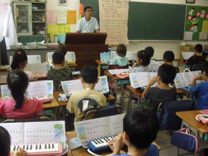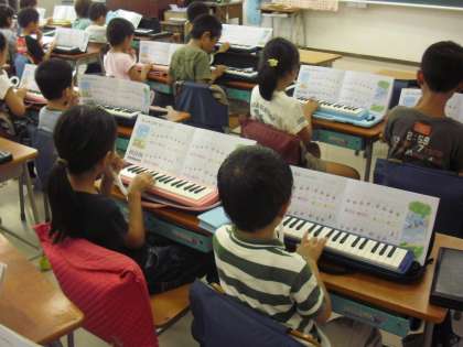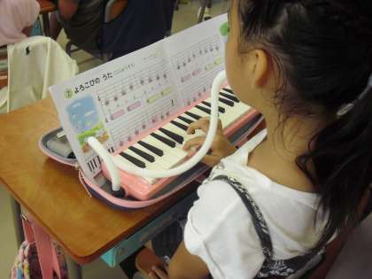 1年生の音楽の授業の様子です。「よころびのうた」を鍵盤ハーモニカで演奏しているところです。音符の音の長さに気をつけながら演奏していました。