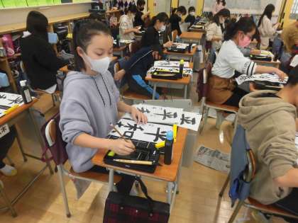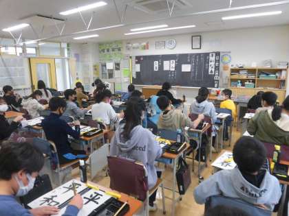 止め・はね・はらいまで、集中を切らさず、力強い作品となりました。掲示された作品を見て、満足した表情をしていました。