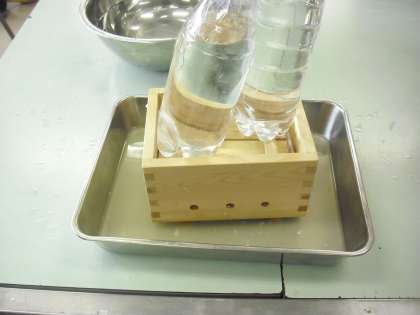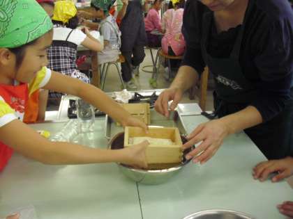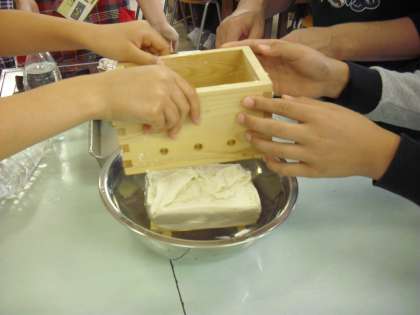 4年生の総合的な学習の時間の授業の様子です。豆腐作りに取り組んでいます。うまく固まっているか慎重に木枠を外すと、どうやら固まっていたようです。