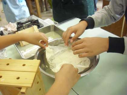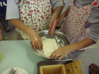 保護者の方にお手伝いいただきながら、四角い豆腐が見事にできあがりました。自分たちで作った豆腐はとてもおいしいです。子どもたちは喜んで食べていました。