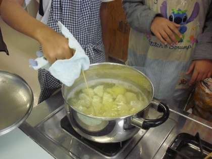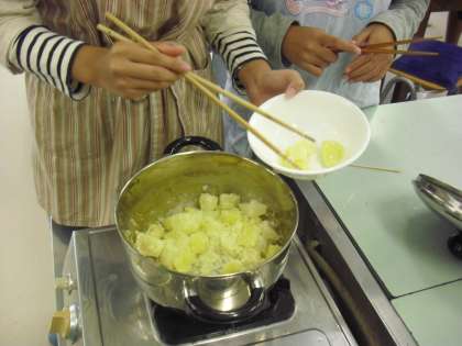 6年生の家庭科の授業の様子です。調理実習で粉ふきいもを作っているところです。家庭科では、食事の役割や体に必要な栄養について学ぶとともに、調理の基礎についても実践的な学習を通して学んでいます。