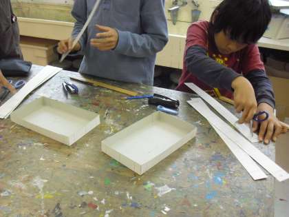 5年生の図画工作の授業の様子です。ビー玉を長い時間転がすことができるような作品の制作に取りかかりました。転がすレーンは工作用紙で作ります。レーンの長さや角度などを考えながら調整し、作っていきます。