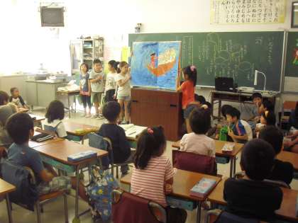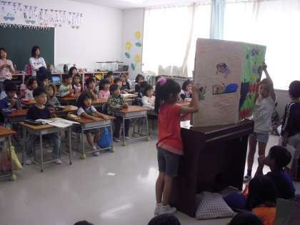2年生が1年生の教室で、大型絵本の読み聞かせをしているところです。1年生や保護者の方を前に2年生の気持ちも引きしまります。堂々とした口調で声を出していました。今後、大型絵本の読み聞かせは、近隣の保育園や芦花ホームなどで行う予定です。読み聞かせを通して、様々な人とかかわっていきます。