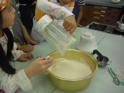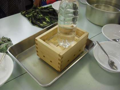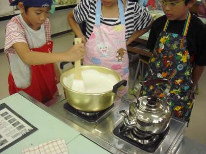 4年生の総合的な学習の時間の授業の様子です。最後のクラスが豆腐づくりをしているところです。ミキサーで大豆を細かくして、火にかけます。こしたものを型に流しこみ重しをのせます。
