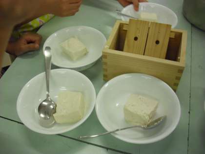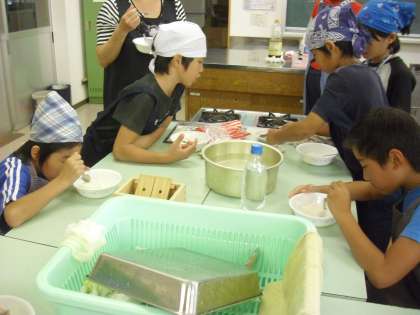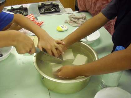 水の中で切り分けて、器に入れます。早速、グループのみんなと試食です。食を通してその大切さを学びます。みんなと楽しく食事をするのも、食育の目標の一つです。この学習を通して、食生活への興味や関心が高まりました。