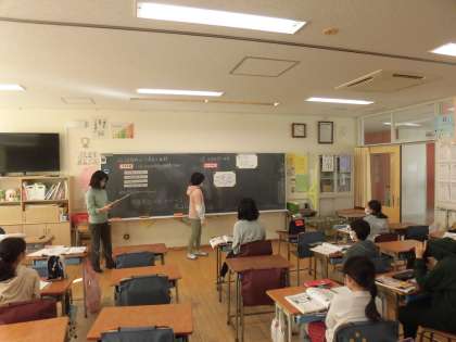 子供たちは、ミニホワイトボードに自分の考えをまとめて、発表をしました。「この四角形の面積はどうしたら求められるのかな?」と、真剣に考えていました。