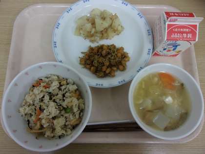今日は「節分」ということで、給食では「大豆とじゃこの甘辛揚げ」を作りました。豆料理が苦手な子供でも、スナック感覚でおいしく食べられる人気料理です。みんなのところにたくさんの「福」が来ますように、給食室から願いを込めて。