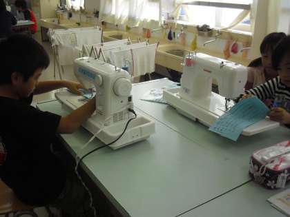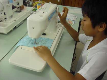 5年生の家庭科の授業の様子です。練習布を使ってミシンの直線縫いを練習しているところです。「快適な衣服と住まい」の学習では、手縫いやミシンを用いて、生活に役立つ物を製作します。