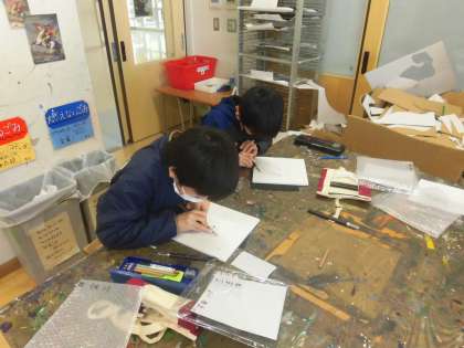 2月3日(木)5・6校時、図工室では、6年2組の図画工作「時計作り」の学習が行われていました。