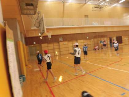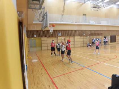 この日は学習の第1時。準備運動をした後は、主運動につながる運動として、ボールの扱いに慣れました。次に、一人30秒間のシュートゲームを行いました。そして、チーム内で攻守に分かれて実践練習を行いました。最後に、試しのゲームを1チーム2試合ずつ取り組みました。