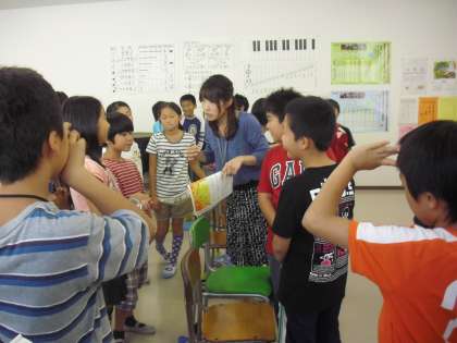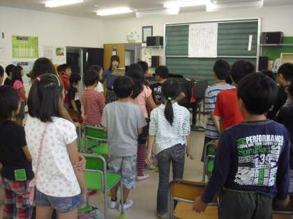 4年生の音楽の授業の様子です。「もみじ」の二部合唱に取り組んでいるところです。お互いのパートを聞き合いながら進めています。メロディが違っていても重なり合うときれいなハーモニーになることを学んでいます。