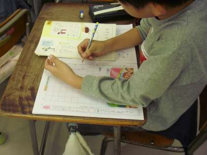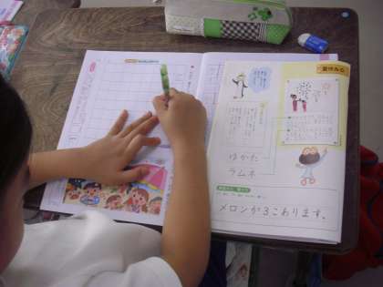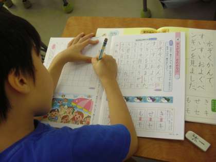2年生の国語の書写の授業の様子です。お手本を見ながら、一文字一文字ゆっくりとていねいに書いています。低学年の書写では、正しい姿勢や筆記用具の持ち方を身に付け、筆順にしたがって文字を正しく書くことが大切です。