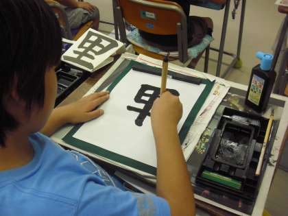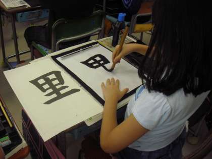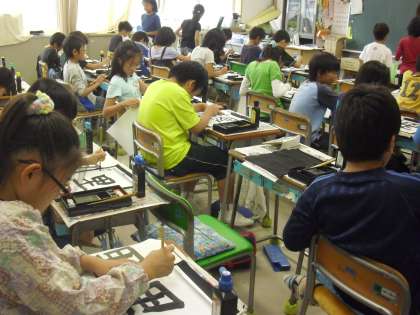 4年生の国語の書写の授業の様子です。「里」という課題文字に取り組んでいます。中学年では、文字の組み立て方を理解し、形を整えて書くことがポイントです。また、毛筆では筆圧にも注意して書くようにします。