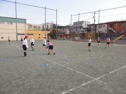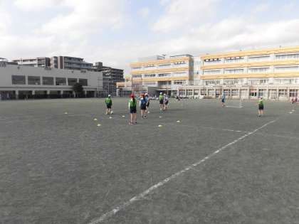 2月15日(火)5校時、校庭では、6年1組の体育「サッカー」の学習が行われていました。