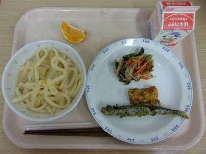 今日は、月に数回の「めん料理」です。うどんをみそ味に仕立てました。“みそ煮込みうどん”としたいところですが、給食室で煮込んでしまうと、教室に行くまでに汁気が全く無くなってしまうため、つゆとめんとを別々に仕上げてから合わせています。