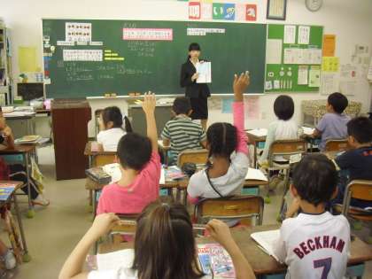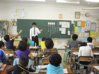 教育実習生の授業の様子です。上は2年生で担当している教師養成塾生の授業です。下は4年生が担当している教育実習生の授業です。子どもたちとも教員と同じように接しています。未来の教員を育てることはとても大切なことです。