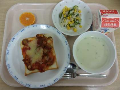 本校では、普段のトーストは、特注の厚切り食パンを縦半分に切って使っていますが、ピザトーストに限っては、食パン1枚の大きさのまま作っていきます。いつもより“塗る面積が2倍、1回に焼ける枚数は半分”になるため、給食室は時間との勝負です。無事に時間通りに提供でき、2月の給食を終えることができました。