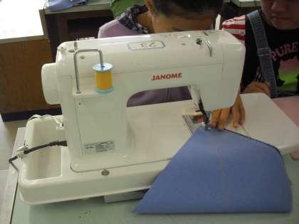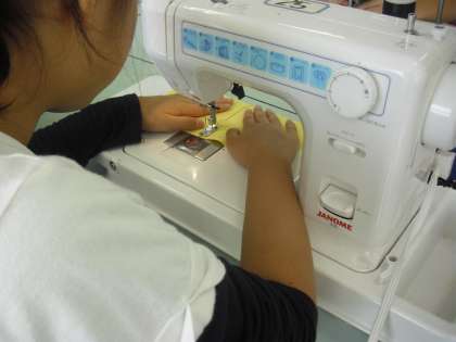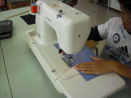5年生の家庭科の授業の様子です。ミシンを使って小物入れの製作に取り組んでいるところです。上糸のかけ方も覚え、友達と教え合いながら自分たちでミシンを使う準備もできます。学習した直線縫いを生かしながら作品作りを進めています。