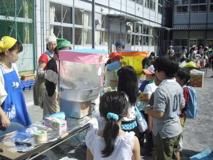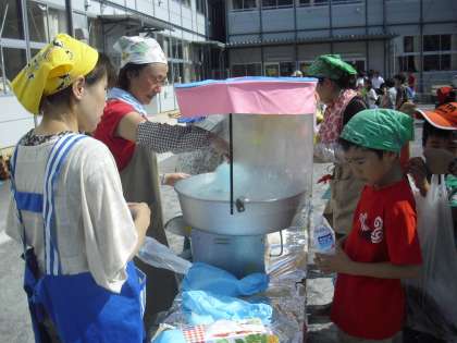 わたあめのお店の様子です。白だけでなく、ブルーやピンク色のわたあめもありました。割りばしに、からめとっていくと丸いわたあめの完成です。子どもたちは、わたあめができあがる様子を興味深く見ていました。