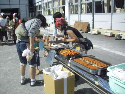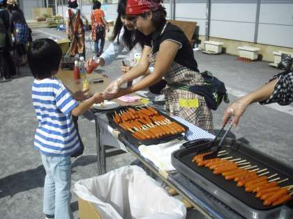 フランクフルトのお店の様子です。早朝から保護者の方々がゆでて火を通したものを焼いています。子どもたちは自分で好きなだけケチャップやからしをかけて食べていました。食べ物コーナーはどのお店も人気です。