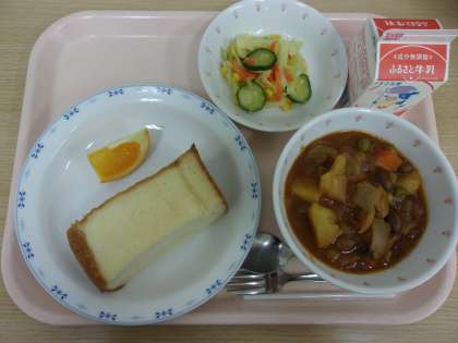 ミルク食パン(東京)、豚肉(北海道)、ベーコン(日本・デンマーク)、冷凍鶏ガラ(神奈川)、バター(北海道・宮崎)、生クリーム(北海道)、豆乳(愛知)、きんとき豆・ホールコーン・じゃがいも・たまねぎ(北海道)、ダイストマト(イタリア)、マッシュルーム水煮(岡山)、冷凍グリンピース(ニュージーランド)、清見オレンジ(和歌山)、にんにく・りんご(青森)、にんじん(千葉)、セロリー・キャベツ(愛知)、きゅうり(群馬)