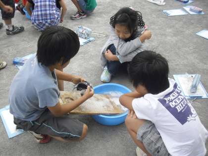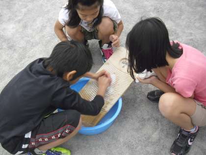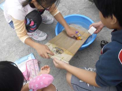 4年生の社会の授業の様子です。「昔のくらしと古い道具」の学習をしているところです。洗濯板を使ってハンドタオル等を洗っているところです。この段階では、正しい使い方を教えていません。子どもたちがその構造から洗い方を考えている場面です。体験することから昔の人のくらしの知恵や工夫を考えていきます。