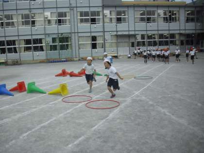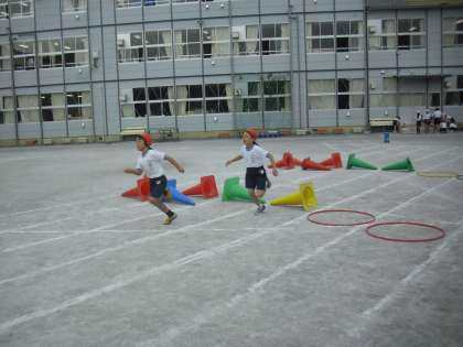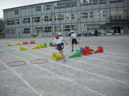 3年生の体育の授業の様子です。小型ハードル走に取り組んでいるところです。高学年の陸上運動のハードル走の前段階の運動です。インターバルの距離や小型ハードルの高さに応じていろいろなリズムで走り越えることがねらいです。リズミカルに走り越えるところに楽しさがある運動です。
