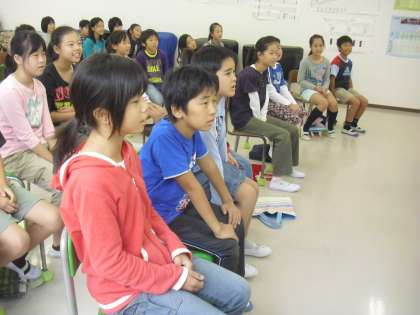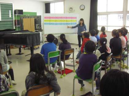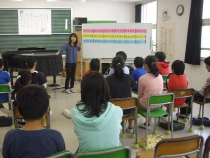 5年生の音楽の授業の様子です。インドネシアの民族音楽ケチャに取り組んでいるところです。異なる3つのリズムを一つに合わせます。事前に実際の映像を見て、自分たちも挑戦しようということになりました。自分のリズムに合わせて声を出していました。