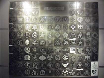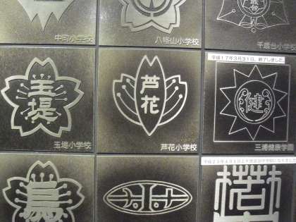 まず、2階の郷土学習室に向かいました。入口前には、世田谷区立幼稚園、小中学校の校章が並んでいました。子どもたちはすぐに、芦花小学校の校章を見付けていました。